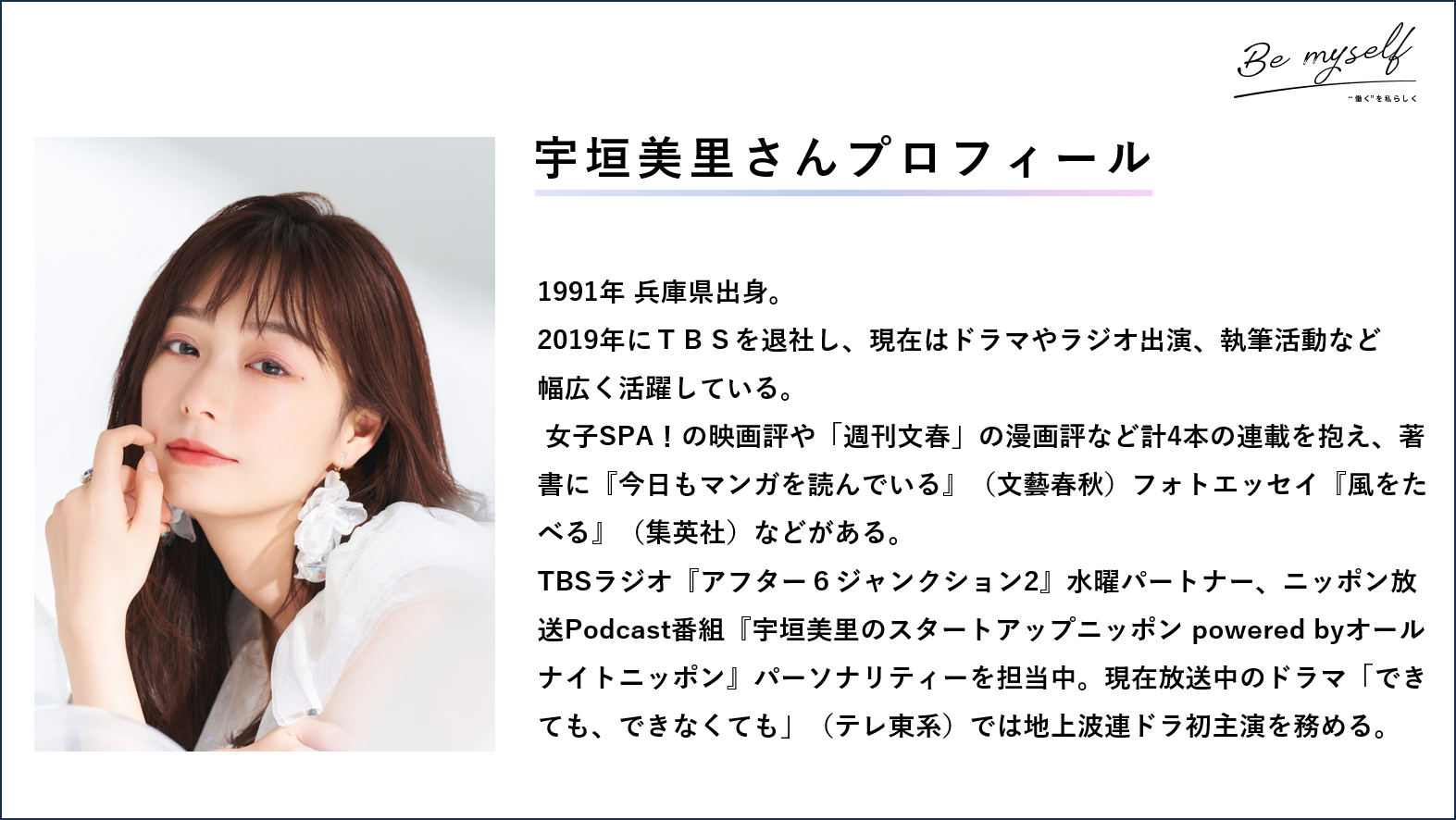 TBSアナウンサーからキャリアをスタートし、現在はアナウンサー、ラジオパーソナリティー、俳優として幅広く活躍する宇垣美里さん。美意識の高さと強くて潔い内面が、多くの働く女性たちの支持を得ています。